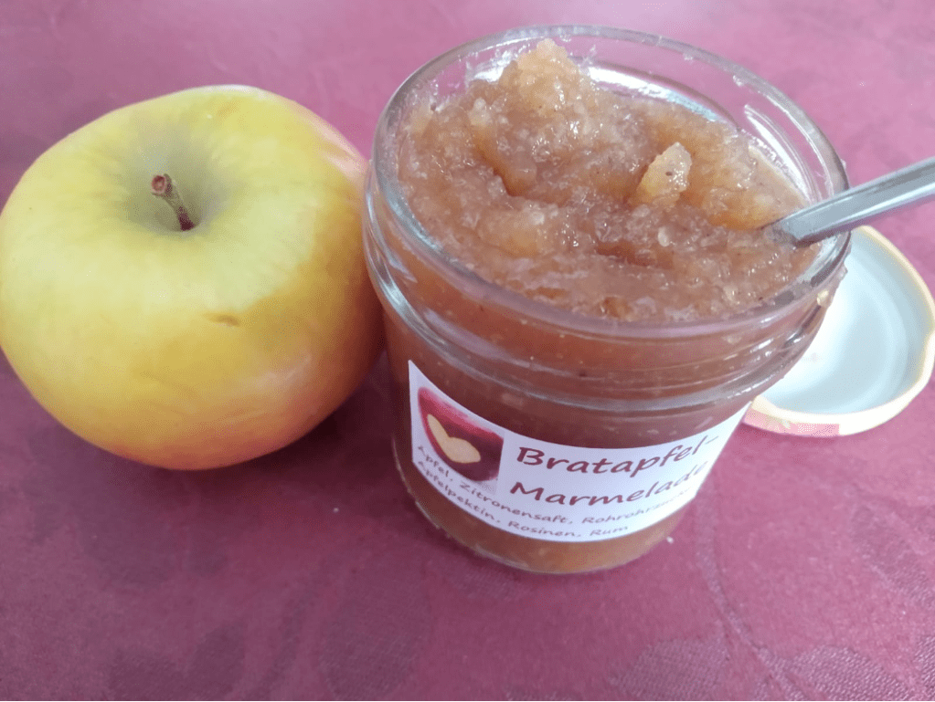 Mit Zimt, Nelken, Kardamom… nach Geschmack würzen, Zucker und Apfelpektin (oder Gelierzucker 2:1) dazu geben und entweder Rumrosinen (also Rosinen die in Rum eingelegt waren) oder Rosinen und einen extra Schluck Rum dazu – kochen, in Gläser abfüllen und fertig.