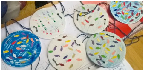 Malt auf der einen Seite ganz viele bunte Fische und auf der anderen Seite ein „Netz“.