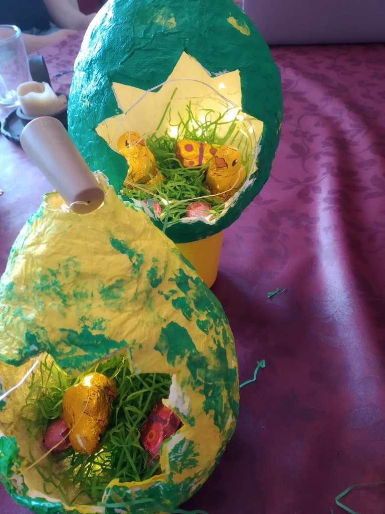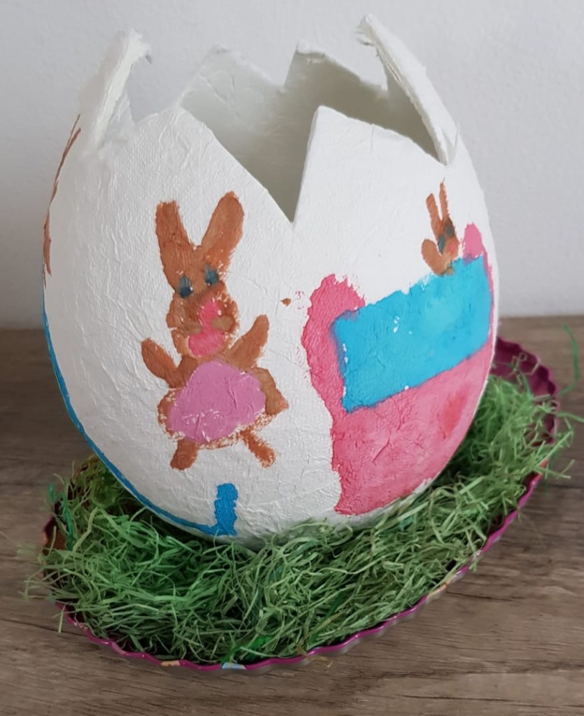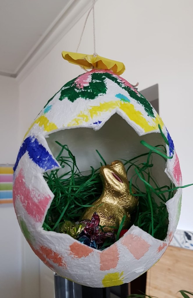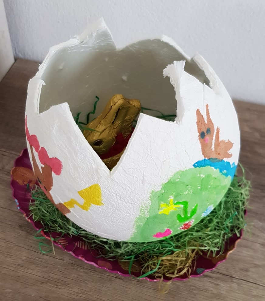 Nun kannst du – wenn du das magst – das Ei bemalen. Wir haben einfache Acrylfarbe genommen. Die Kids wollten so gerne mal mit Farbe und Pinsel malen 🙂