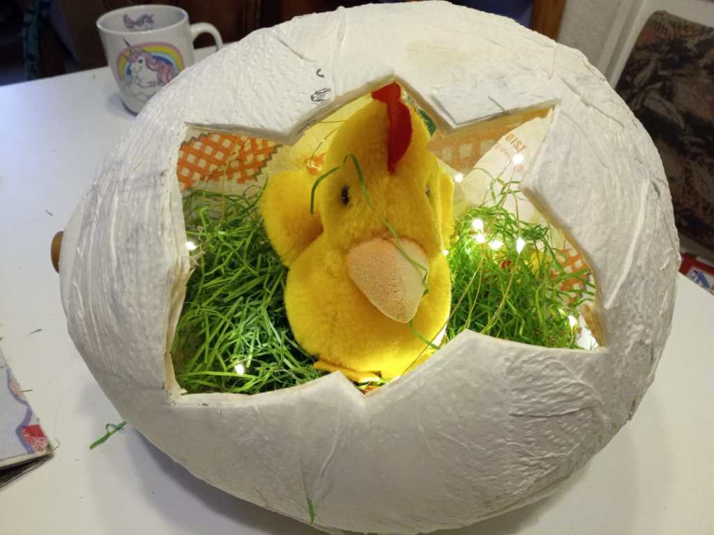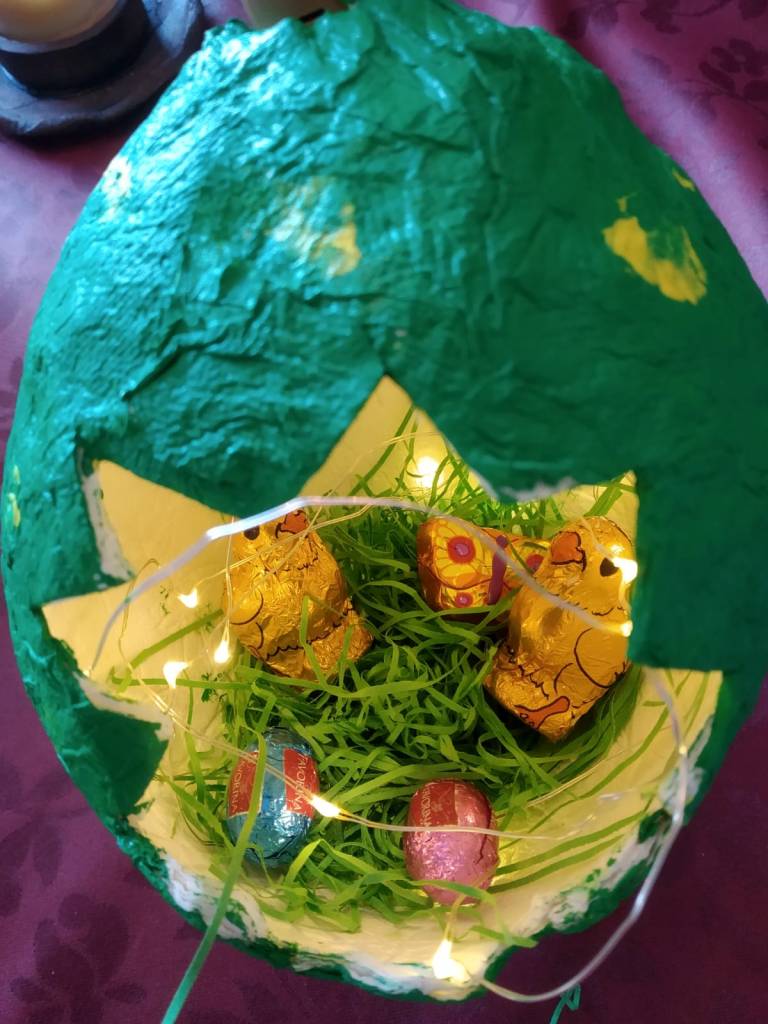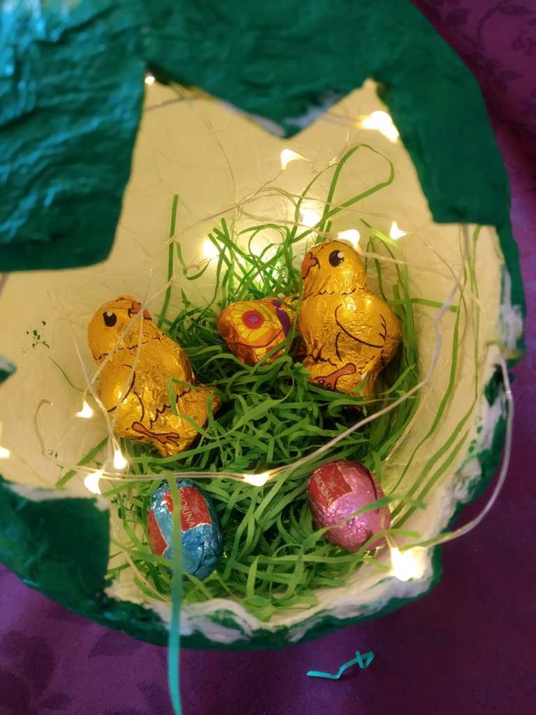 etwas Ostergras, kleine Kücken z.B. aus Schokolade und andere Deko nach Belieben.