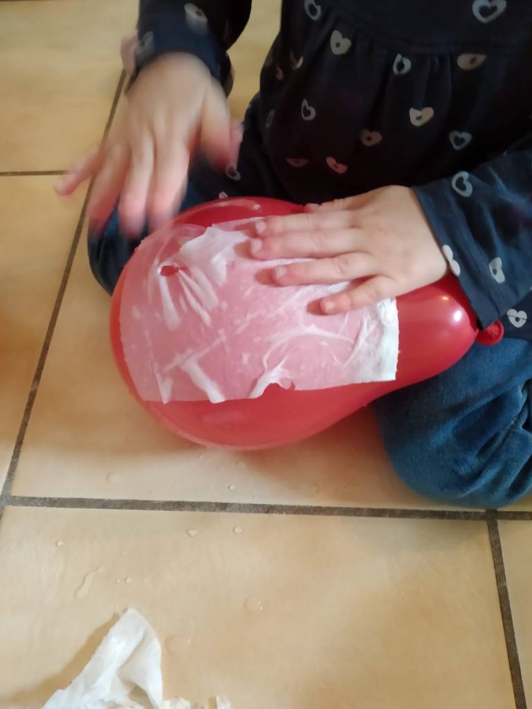 Dann Toilettenpapier in Stücke reißen, einfach kurz in Wasser tauchen und auf den Luftballon legen – oder besser gesagt: draufpatschen. Den Kids hat das Gematsche viel Spaß gemacht – und zum Glück ist es ja nur Wasser 😉