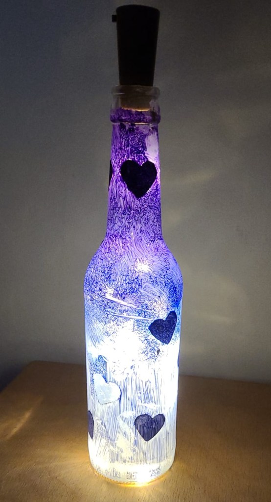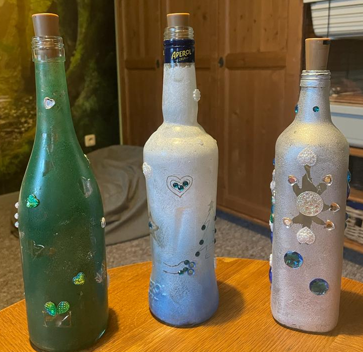 Jetzt kannst du mit einem spitzen Gegenstand Muster in die Farbe ritzen, also Farbe wieder abkratzen oder die aufgeklebten Sterne/ Herzen… wieder ablösen, wenn du magst. Außerdem kann die Flasche mit Edelsteinchen, Metalldraht… verziert werden. Probiere es einfach aus 🙂