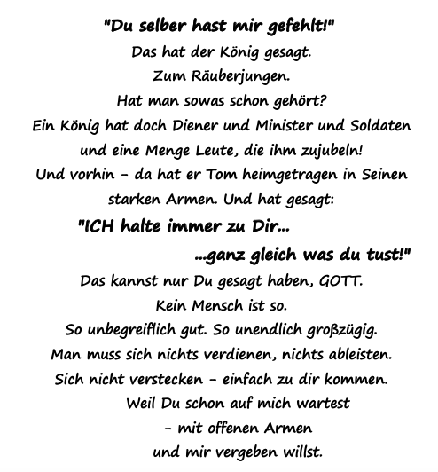 Der König sagt zu Tom: „Mein Kind, musst du eine Angst gehabt haben! Aber warum bist du davongelaufen? Warum versteckst du dich vor mir? Schuld verstecken ist das Schlimmste für dich und für mich. Glaub mir, ich halte immer zu dir, ganz gleich was du tust. Auch wenn du mal etwas falsch gemacht hast, kommst du am besten gleich zu mir. Ich kann alles wieder gut machen.“