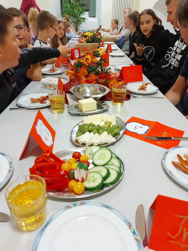 Am Abend haben wir uns dann noch einmal richtig vorgestellt – zum einen mit unserem Wappen, welches dann auf die Rückseite der Tischkärtchen geklebt wurde. Und zum anderen hatte Robin noch eine gute Idee: jeder durfte so viele Weinbeeren nehmen wie er wollte – musste dann aber so viele Dinge über sich erzählen wie er Beeren hatte 🙂