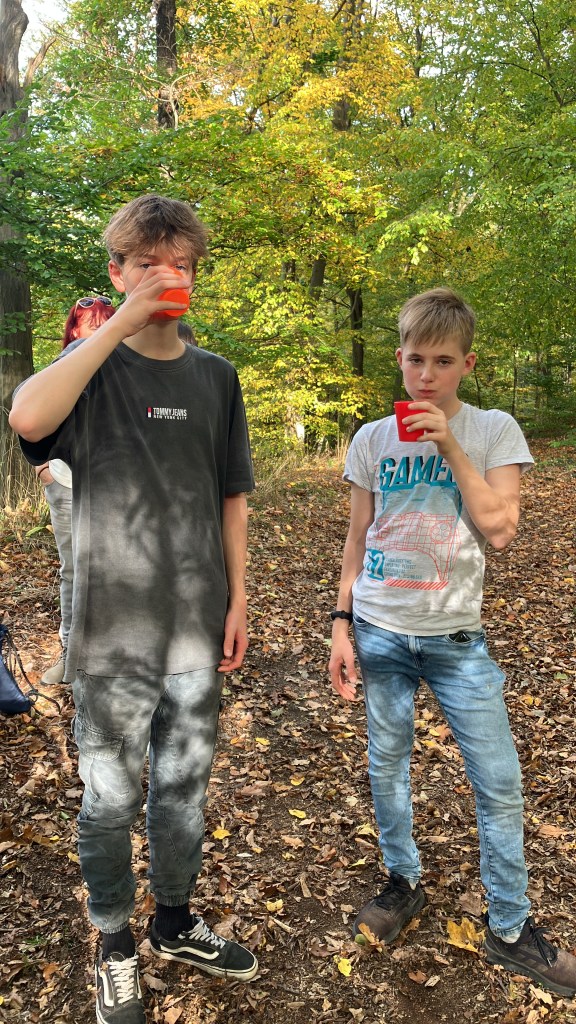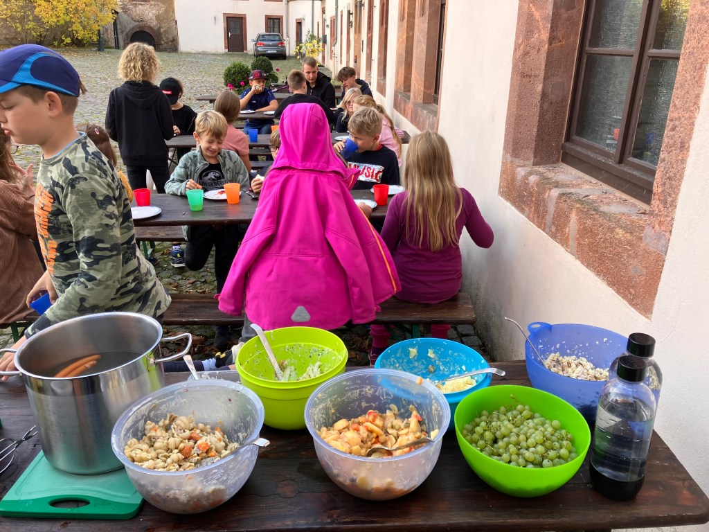 Nach einem „Räuberessen“ mit leckeren Salaten (DANKE an die Köchinnen!) und Würstchen marschierten wir bei schönstem Sonnenschein in den Wald.
