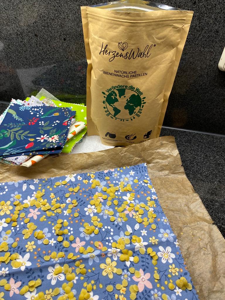 Dann legt man den Stoff auf Backpapier und gibt „Bio“-Bienenwachspastillen darauf. Beim Kauf der Bienenwachspastillen sollte man auf gute Qualität achten, die auch für für Kosmetik geeignet ist.