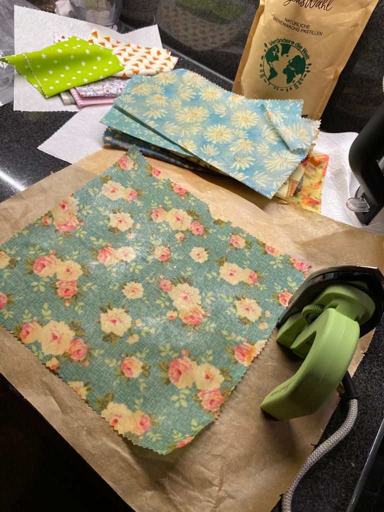 Ich habe dann noch einmal mit einem Encaustik-eisen glatt gebügelt und geschaut, dass wirklich in allen Ecken Wachs ist. Man kann das auch mit einem normalen Bügeleisen machen, wenn man den Stoff zwischen Backpapier legt.