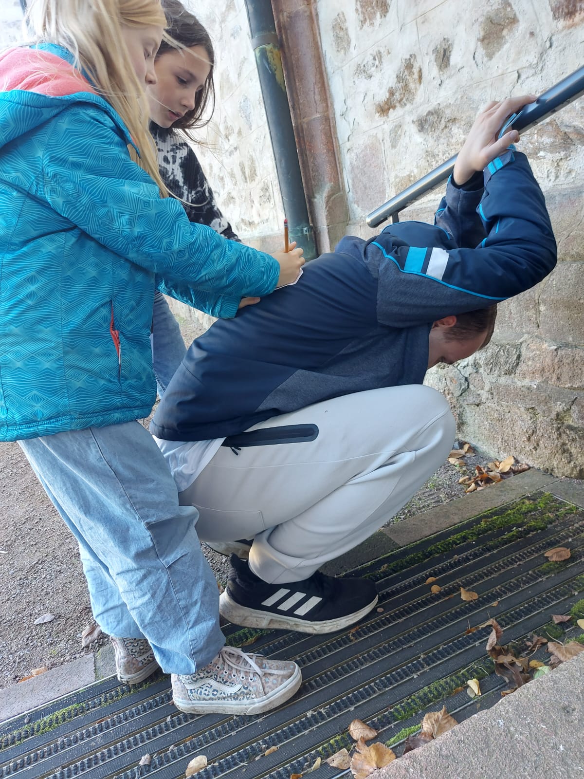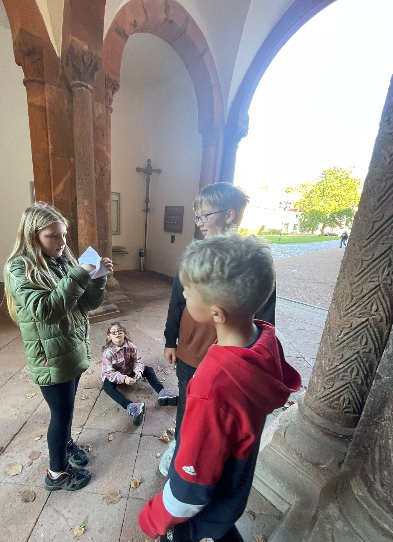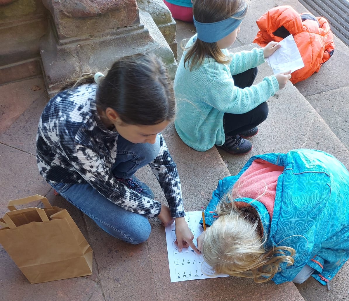 Am Nachmittag gab es denn ein Geländespiel, wo man lauter Geheimcodes entziffern und knacken musste. Das war ganz schön knifflig und wir sind ziemlich durch den Park geflitzt: Wir waren in der „Wüste“, im „Geheimnis“- Labyrinth, im „Stille“-Garten, beim „Tauf-erinnungswasser“, im „Nacht“-Schacht…