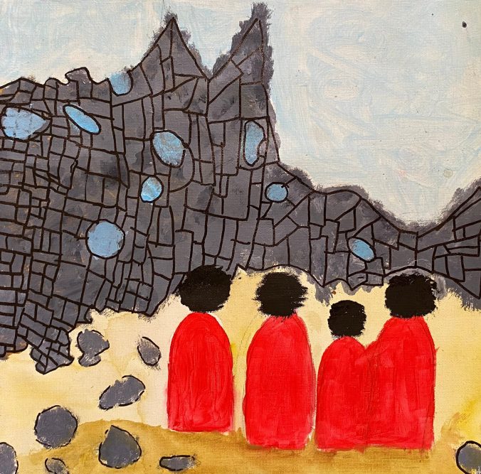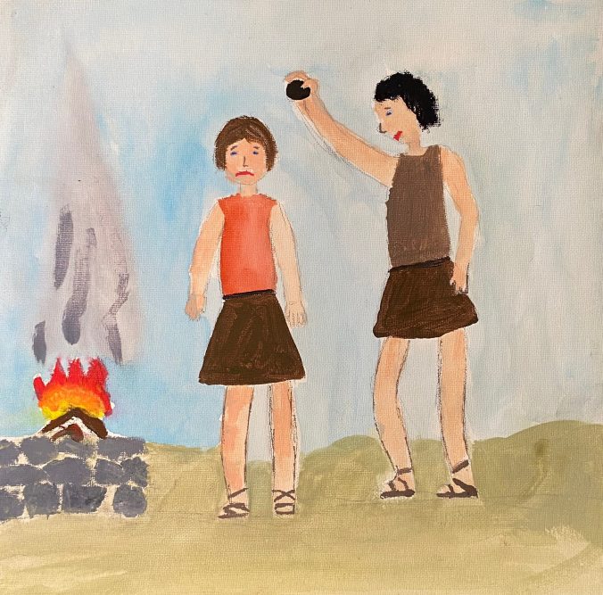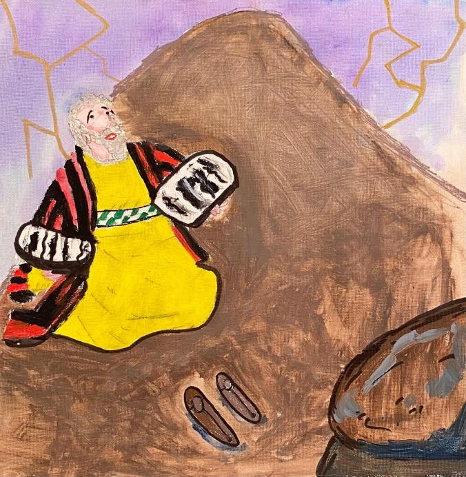Mose wird am brennenden Dornbusch von Gott berufen – auch dieses Bild hat Lisbeth wunderschön und ganz alleine gemalt.