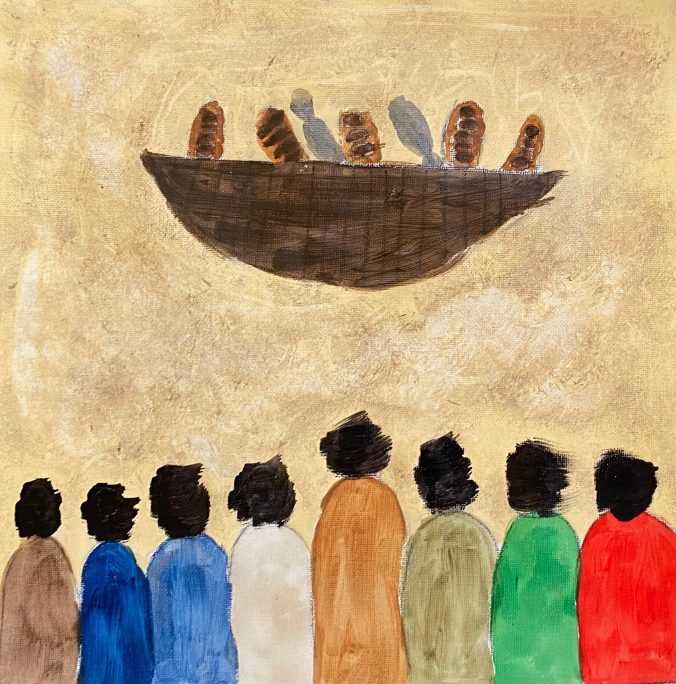 Jesus braucht nicht viel um tausende Menschen satt zu machen – super gemalt von Nele, die selber gerne kocht