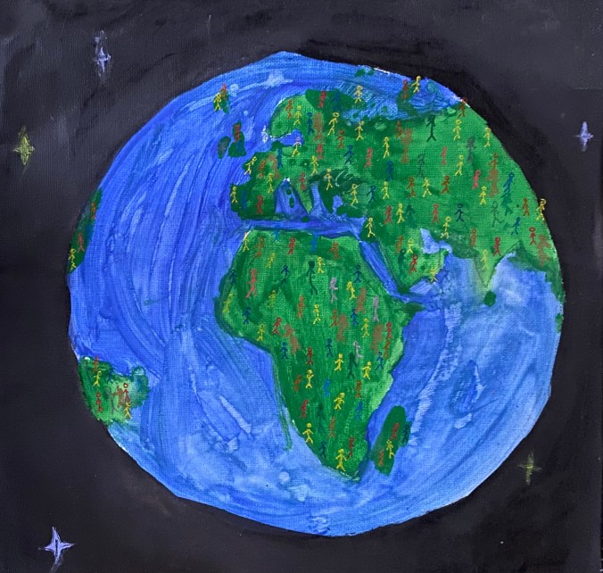 Auf der ganzen Welt gibt es nun Christen. Hannes hat die Welt extra grün gemalt, weil wir Hoffnung haben dürfen.