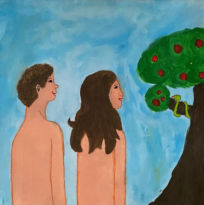 „Sollte Gott gesagt haben…?“ Die verführerische Schlange sät Misstrauen gegen Gott – toll gemalt von Kira