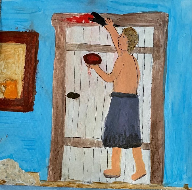 Damit der Todesengel vorrübergeht, wird das Blut eines Lammes an die Tür gestrichen – Amelie und ihre Schwester haben das toll gemalt.