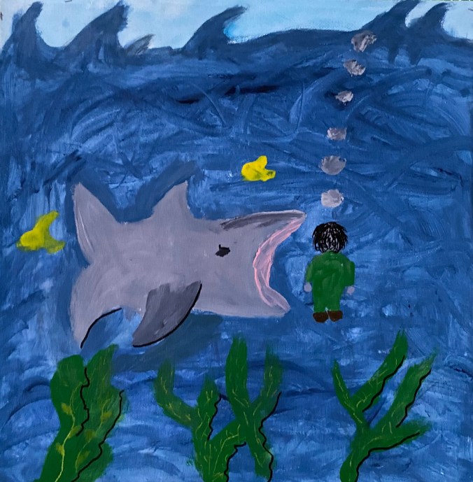 Jona wird gerade vom Wal verschluckt und damit gerettet, um Ninive zu warnen – cool gemalt von Johann