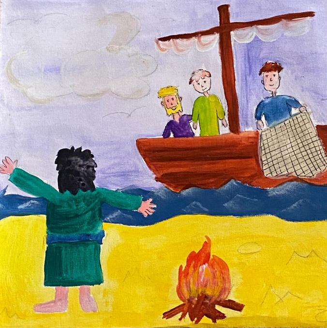 Jesus wartet schon mit Frühstück auf seine Jünger, besonders auf Petrus, damit alles wieder gut ist zwischen ihnen. Danke Emilia!