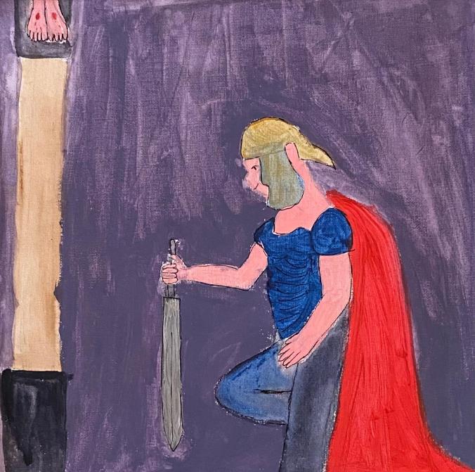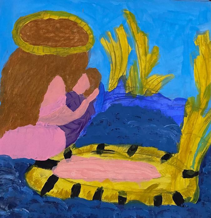 Amelie liebt die Geschichte von der Rettung Moses und hat eine coole Prinszessin gemalt. (leider hat das Bild nicht mehr auf das Fastentuch gepasst, dafür liegt es als besonderes Exemplar auf dem Altar)