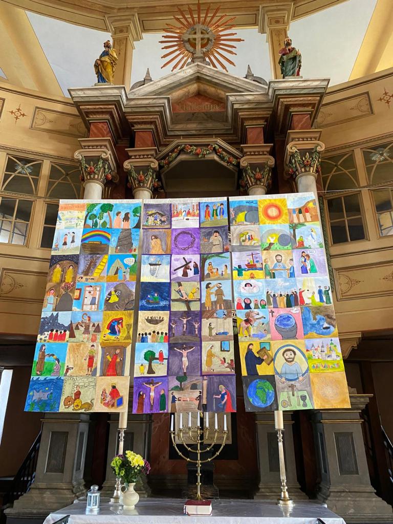 Das Ostertuch zeigt die Geschichten rund um die Auferstehung Jesu und wie es danach weiterging.