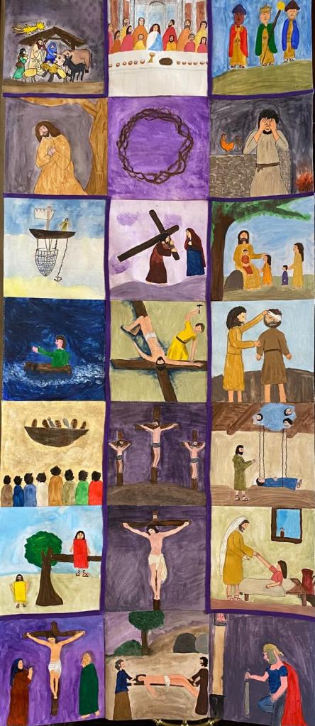 Zur Christenlehre gehören die Geschichten aus der Bibel. Wir wollten ein Fastentuch mit unseren Lieblingsgeschichten gestalten. Das war gar nicht so einfach. Zum einen, weil es ziemlich viele Lieblingsgeschichten gab und zum anderen, weil manche besonders oft vorkamen – wir hätten die Arche Noah bestimmt 5 mal malen können 🙂 Aber auch der Turmbau zu Babel wäre fast doppelt gemalt worden. Und der Plan musste noch ein paar mal geändert werden, um die Geschichten unterzukriegen.
